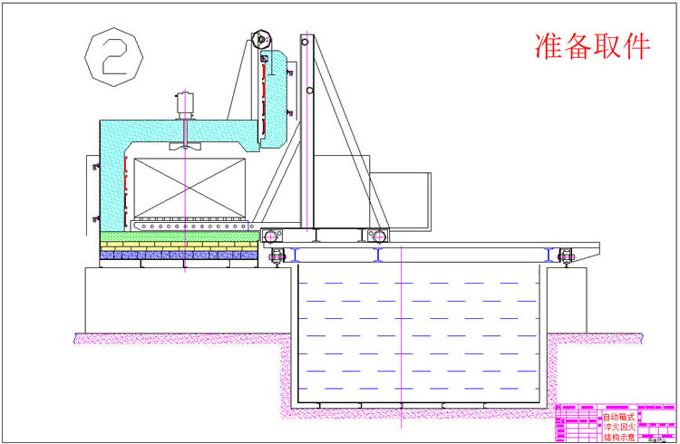 2、淬火裝爐:把料筐吊到裝料平臺(tái)上(只需要操作一次)——人工把工件裝入料筐(需方自備)后——按動(dòng)放料按鈕——中轉(zhuǎn)車從裝料平臺(tái)上叉取料筐上升50mm——中轉(zhuǎn)車后退——中轉(zhuǎn)車移向淬火爐位置——淬火爐門開啟——中轉(zhuǎn)車把工件送入爐膛——中轉(zhuǎn)車自動(dòng)退出——爐門關(guān)閉——加熱爐啟動(dòng)加熱——裝爐工作完成。